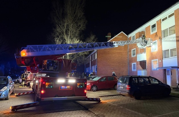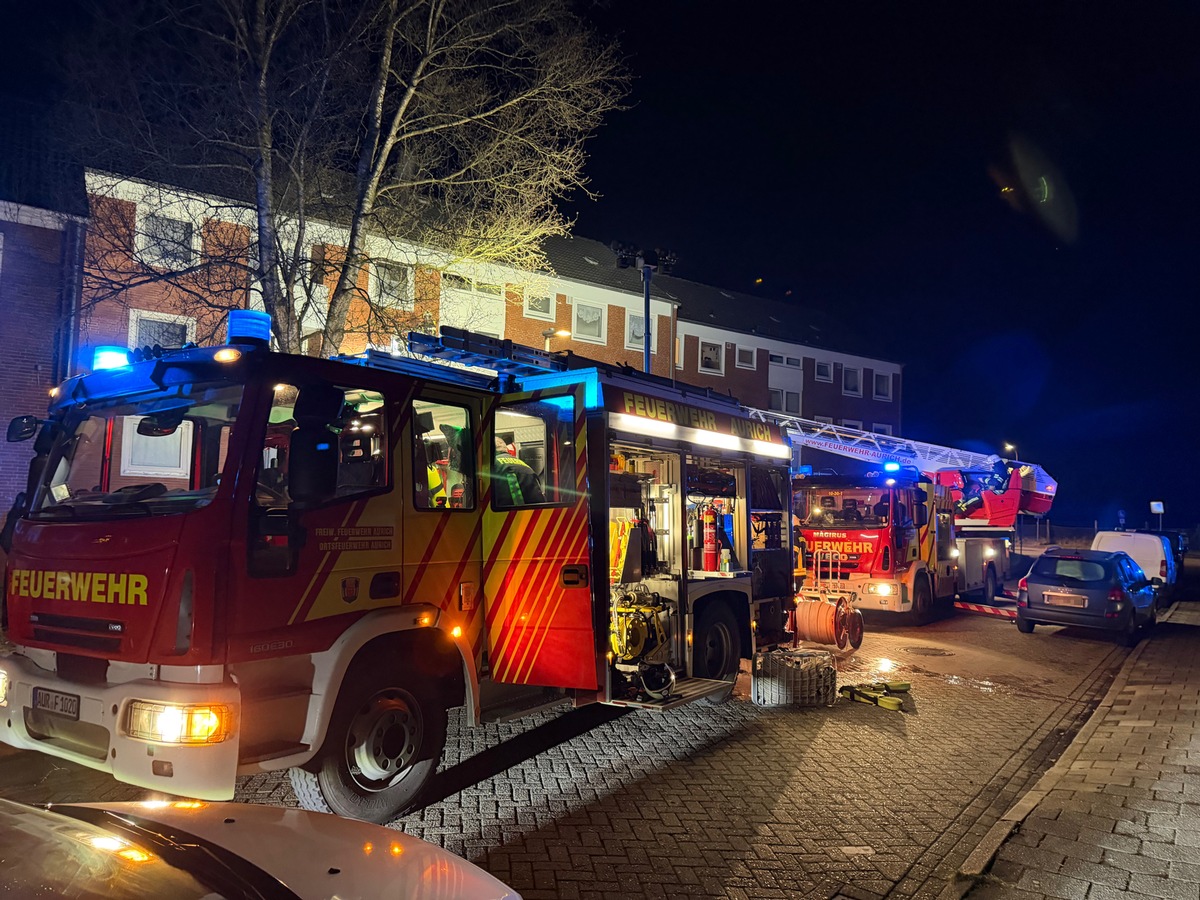 Noch gerade rechtzeitig sind Bewohner eines Mehrfamilienhauses in der Thüringer Straße am Montagabend aus ihrer Obergeschosswohnung gelangt, in der zuvor ein Feuer im Bereich der Küche ausgebrochen war. Nachdem sie in der Folge einen Notruf abgesetzt hatten, wurde die Feuerwehr Aurich gegen 18:45 Uhr zu der gemeldeten Adresse alarmiert. Atemschutzgeräteträger gingen umgehend in die stark verrauchten Räumlichkeiten vor. Parallel ist die Drehleiter vor dem bereits geräumten Gebäude in Stellung gebracht worden.