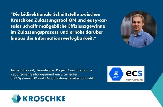 "Die bidirektionale Schnittstelle zwischen Kroschkes ON und easy-car-sales schafft maßgebliche Effizienzgewinne im Zulassungsprozess und erhöht darüber hinaus die Informationsverfügbarkeit", sagt Jochen Konrad, Teamleader Project Coordination & Requirements Management easy-car-sales bei SEG.