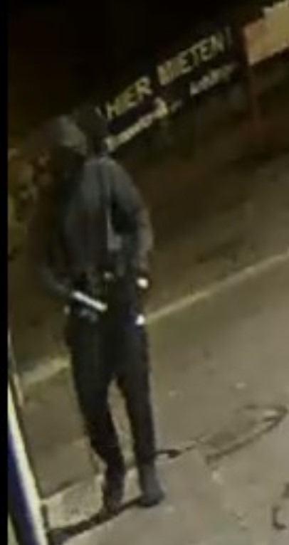 Mit einer Öffentlichkeitsfahndung und Fotos aus der Überwachungskamera fahndet die Polizei jetzt nach dem bislang unbekannten Mann (siehe Fotos). Der maskierte Mann ist ca. 20 bis 25 Jahre alt, ca. 180 cm groß und dünn. Er trug eine schwarze Steppjacke, mit einem roten Markenlogo rechts unten am Bund. Weiter trug er eine schwarze Hose und auch schwarze Handschuhe, beides evtl. von adidas. Seine schwarzen Schuhe hatten eine weiße Sohle. Die mitgeführte Bauchtasche war ebenfalls schwarz mit einem Logo als Schriftzug. Der unbekannte Mann sprach akzentfrei Deutsch.