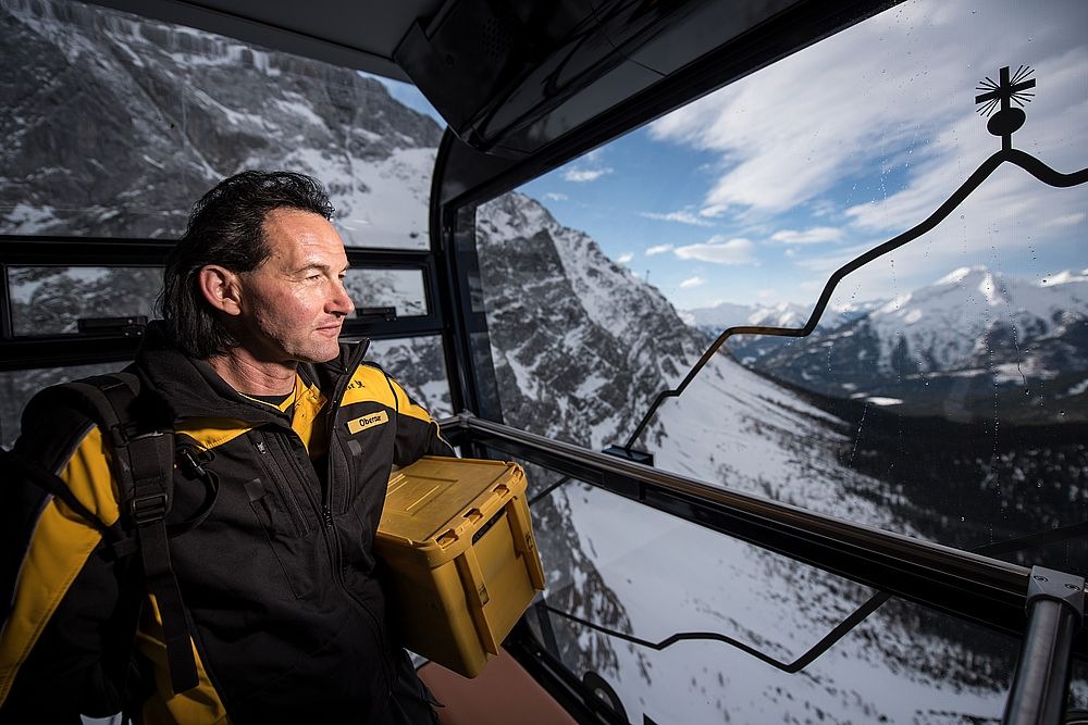 DHL Group operates Germany's highest post office – on the Zugspitze in the Alps, at an altitude of about 2,600 meters. Postal worker Andreas Oberauer delivers letters and packages daily to one of the most remote locations in the country and empties the mailbox on the mountain plateau – via cable car. Whether in sunshine or stormy weather, he reliably brings the mail via the Zugspitzbahn to the restaurants and viewing platform. "The breathtaking view makes up for a lot, even if the weather is sometimes stormy,” says Oberauer.