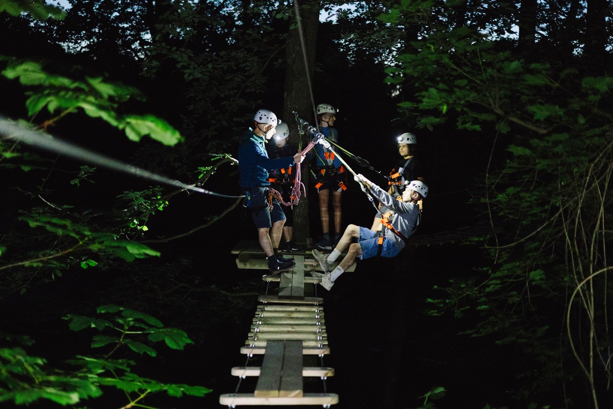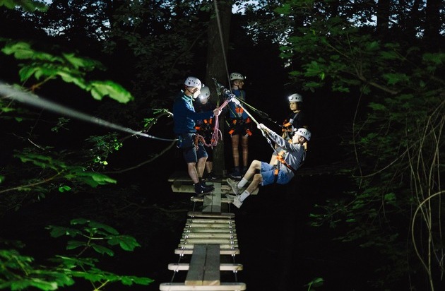 Licht aus und los geht das Abenteuer im Waldklettergarten Pforzheim: Mit professioneller Kletterausrüstung und Stirnlampe startet die Entdeckungsreise durch die Dunkelheit. In der Stille der Nacht herrscht im Wildpark eine besondere Stimmung und vermeintlich vertrautes Terrain offenbart im neuen Licht so manche unerwartete Herausforderung, etwa an der acht Meter hohen Kletterwand. Von dort fährt eine Seilbahn auf 90 Metern ins Dunkel. Damit trotz mangelnder Beleuchtung niemand zu Schaden kommt, überwachen erfahrene Hochseilprofis die Kletterpartie.