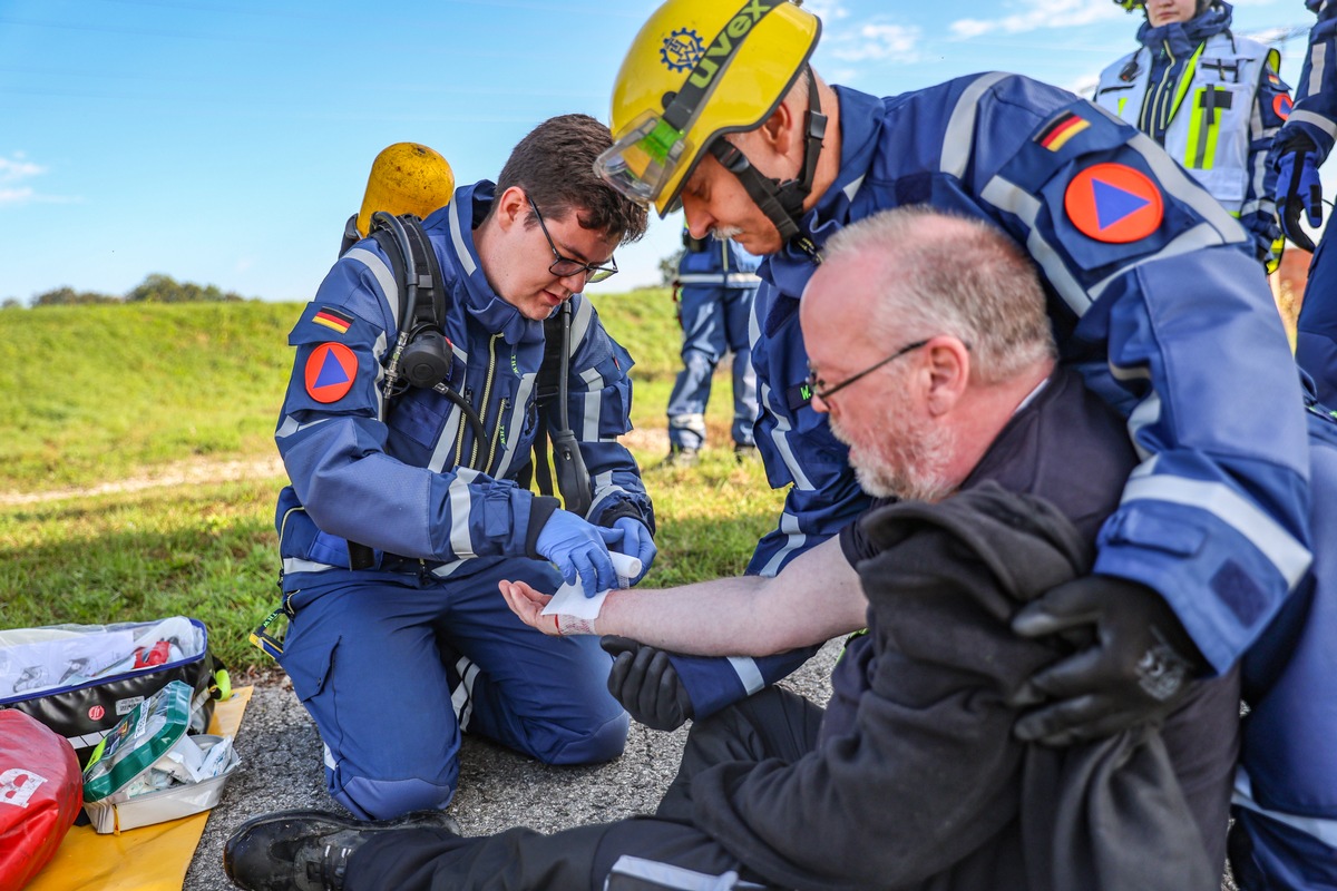 So geschah es mehrere Male auf dem weitläufigen Gelände, das vom THW an diesem heißen Spätsommerwochenende Mitte September zur Zivilschutzübung 'Blaues Chamäleon' genutzt wurde. Die zehn Ortsverbände des Regionalbereichs Nürnberg kamen zusammen, um ein aktuelles Bedrohungsszenario abzuarbeiten: Krieg an der NATO-Ostgrenze, Luftangriffe auf deutsches Gebiet, um die Logistik und Infrastruktur des NATO-Bündnisses zu zerstören, viele verletzte Zivilisten.