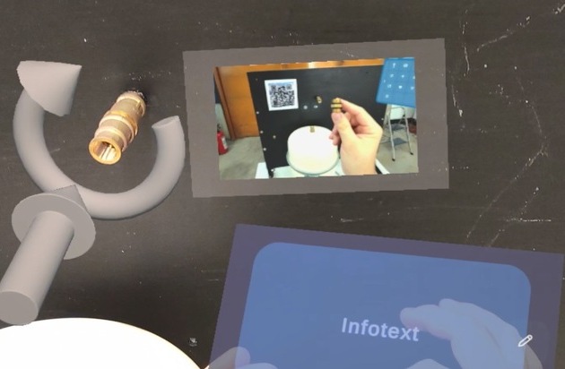 Darüber hinaus können Lernende die erstellte Anleitung über ihr Endgerät abrufen. An der vorgesehenen Stelle im realen Raum werden die zuvor erstellten digitalen Elemente eingeblendet und führen die Person schrittweise und multimedial durch den technischen Prozess. Die App ist auf AR-, MR- und XR-Brillen sowie auf Tablets und Smartphones nutzbar.