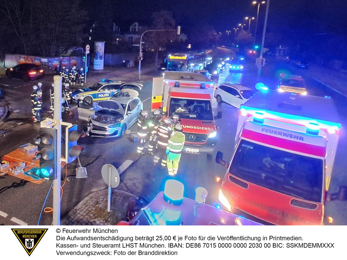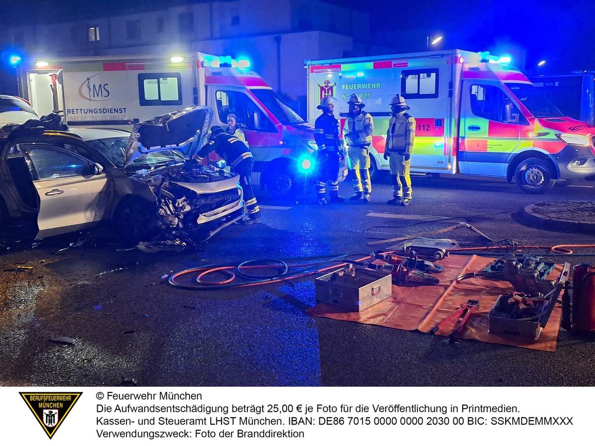 Nach einem Verkehrsunfall ist ein Verletzter von der Feuerwehr München mit technischem Gerät befreit worden. Insgesamt verlief der Unfall glimpflich.